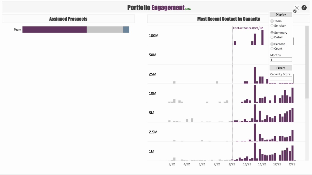 - Most Recent Contact by Capacity: This view displays all of the most recent contact activity with every assigned prospect broken out by two data points: gift capacity on the X axis, and the date of last contact on the Y axis.