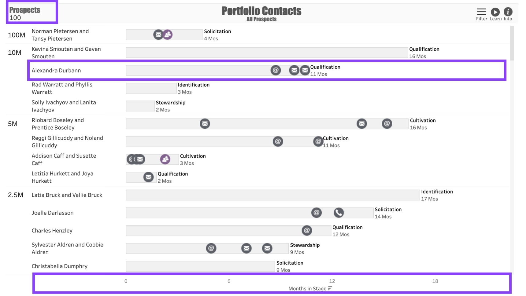 The body of the dashboard shows Prospects arranged by their Gift Capacity. Each prospect name is followed by a Timeline showing how long the prospect has been in their current Stage. Along the timeline are Icons representing the timing and nature of each touchpoint that has happened since the prospect entered their current stage. Hovering over any of the icons will cause a Tooltip to appear that summarizes the Interaction represented by the icon.