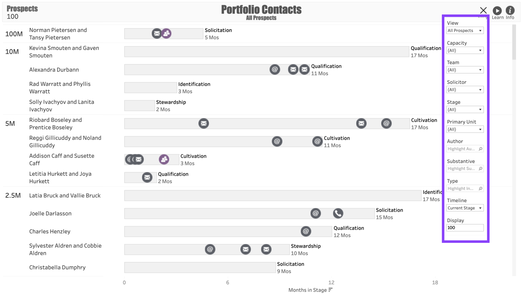 View: This filter allows you to choose between All Prospects, prospects that are 24+ Months in Stage, and prospects that are 36+ Months in Stage. Use the latter two filters to quickly identify prospects who may be stagnating in your portfolio.