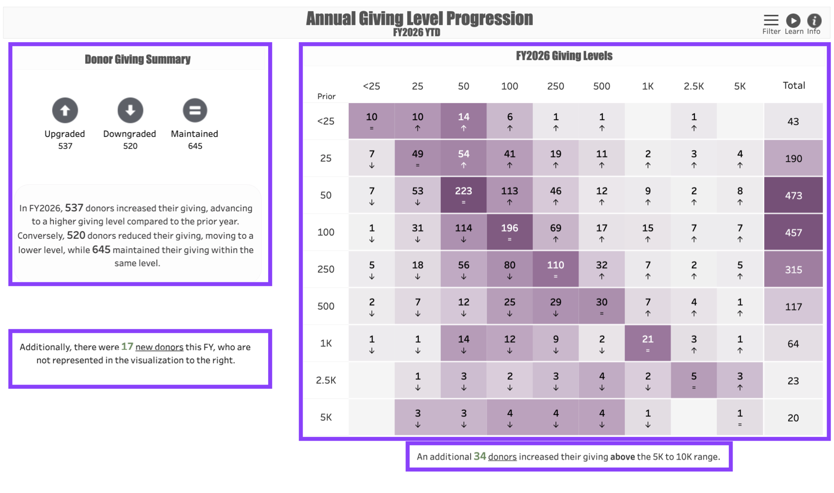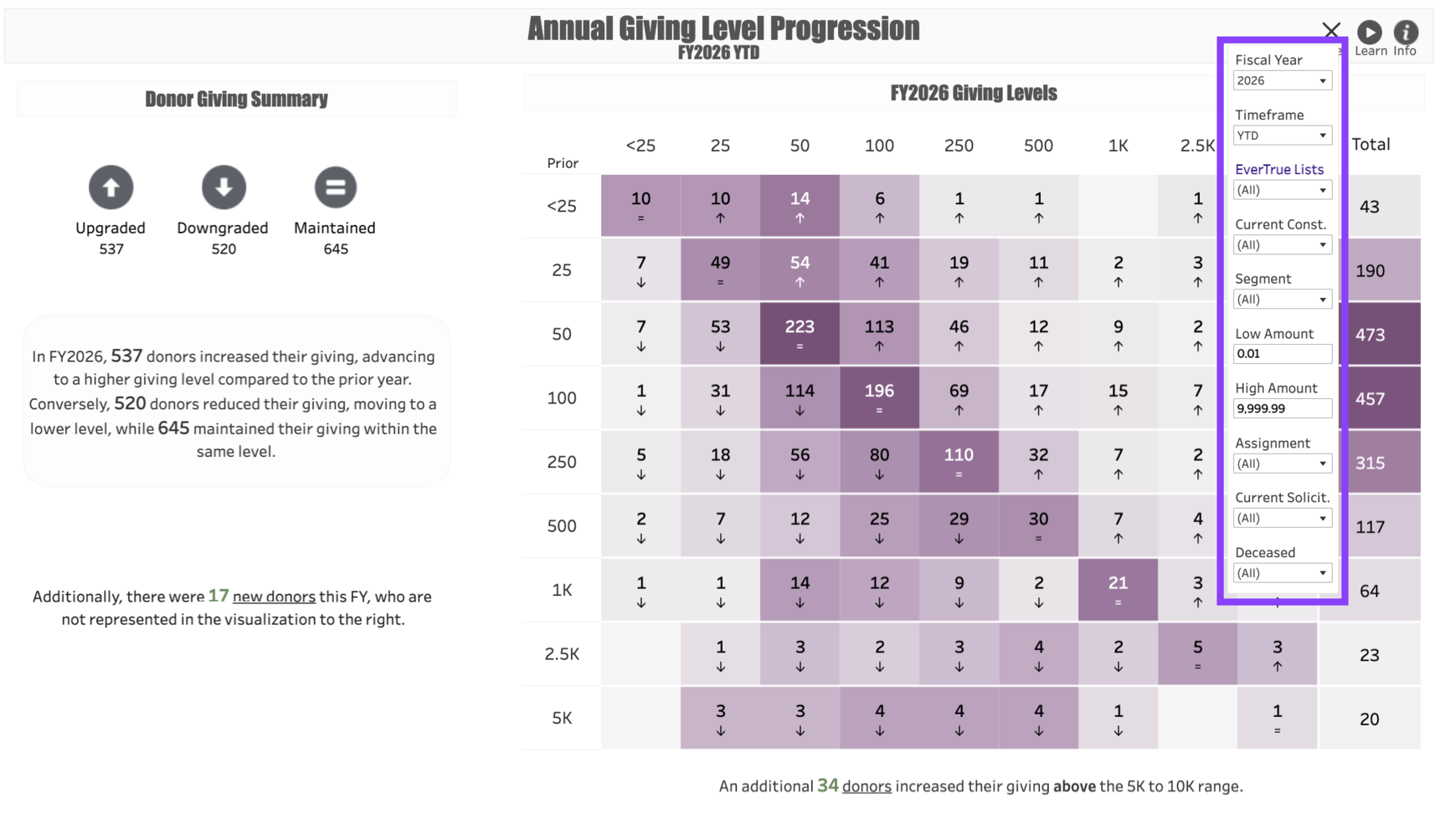 Fiscal Year: This represents the fiscal year you would like to measure. Regardless of what year you put in this filter, the Prior Year of giving will indicate whatever year prior to that year that the donor last gave. For example, if you enter 2026 as the fiscal year and a donor’s last gift was made in 2023, their Giving Level would be indicated by the column that matches their total 2026 giving year-to-date and the row that matches their 2023 gift by today’s date in 2023.