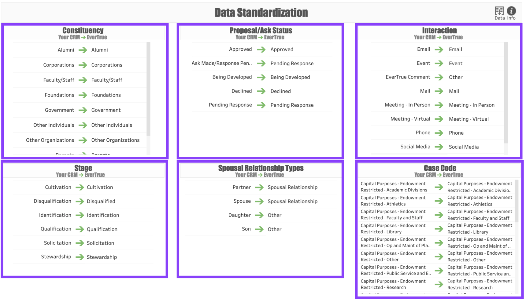 Data Standardization is a dashboard to help you get the most out of your other Clarity dashboards by helping you see how EverTrue is currently interpreting your data.