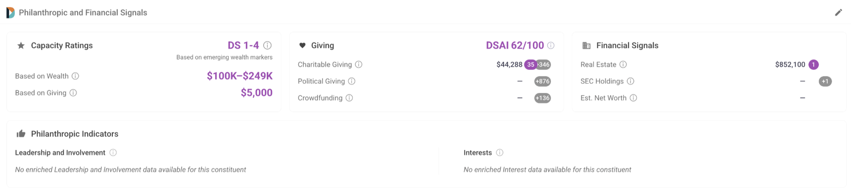 - Transformed the former Wealth & Assets section into a more comprehensive, insight-driven view of donor wealth, philanthropy, and giving potential called Philanthropic and Financial Signals. Read our full help article here.