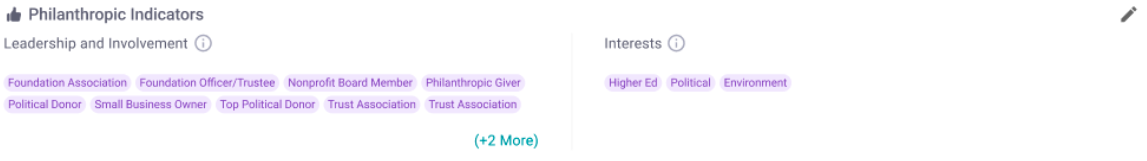 Roles and affiliations that signal philanthropic engagement (e.g. Foundation Officer/Trustee, Nonprofit Board Member, Political Donor), displayed as tags. This displays the same data in the existing Wealth Indicators section of the Enrichment tab.