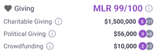 This card displays philanthropic behavior across charitable, political, and crowdfunding sources. For DonorSearch customers, clicking totals or counts opens a detailed drill-down view where high and low confidence matches are visible. For Signal-only customers, the totals are not clickable. To upgrade access, please contact your Customer Success Manager.