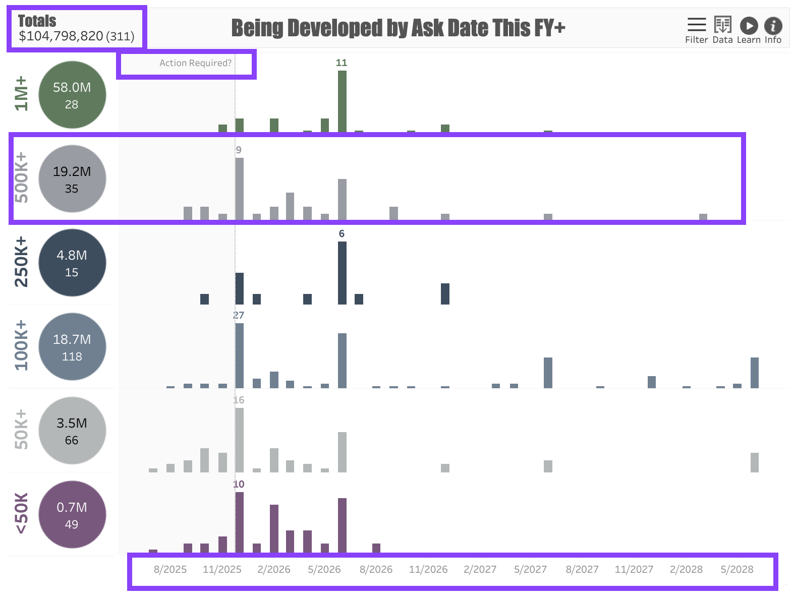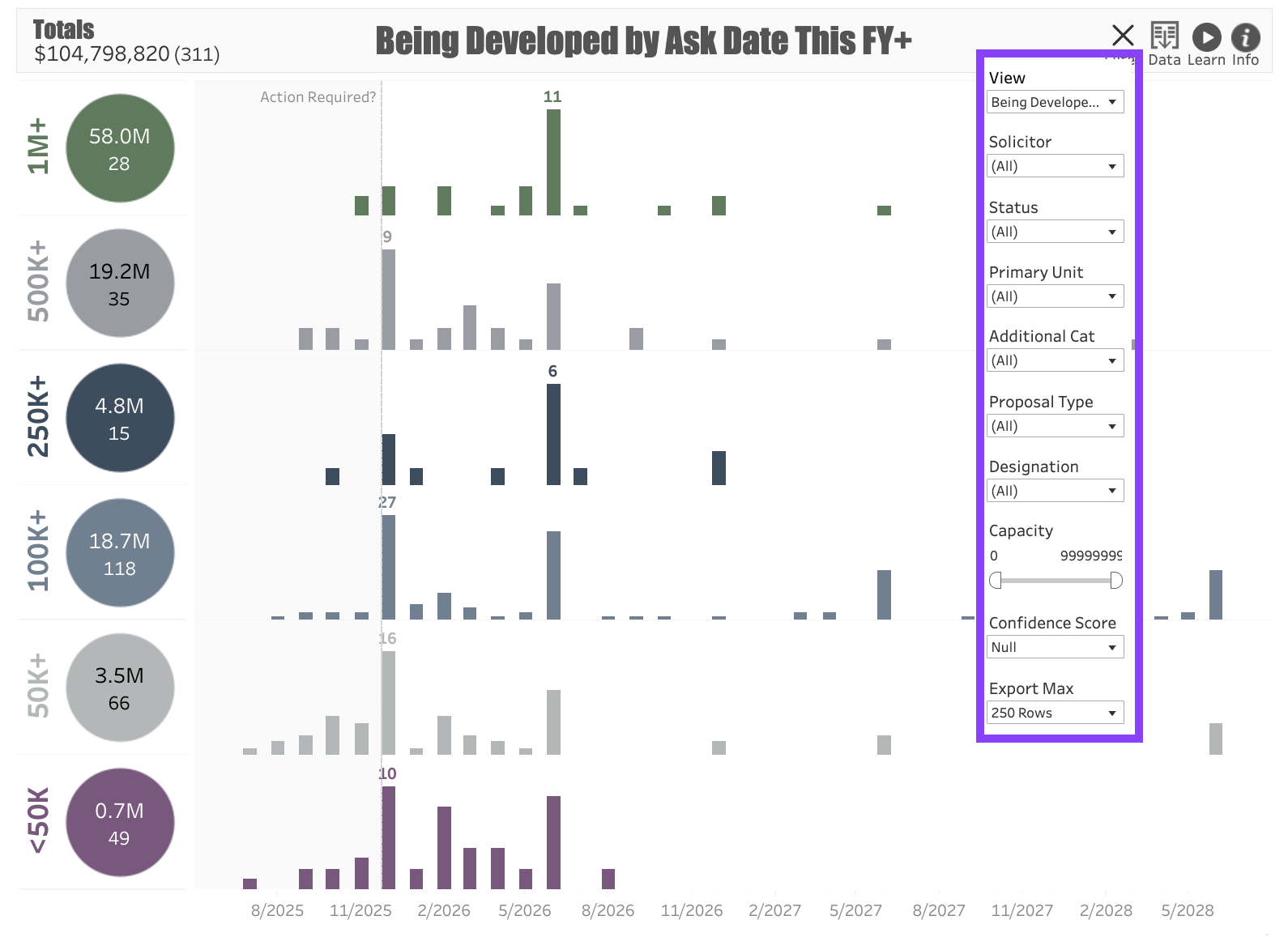 The dashboard shows Tiers of proposals organized by Ask Amount. For example, if the ask amount is between $500,000 - $999,999, the proposal will appear in the $500K+ tier. Each tier is marked with a circle showing the total dollar value and count of the proposals in the tier.